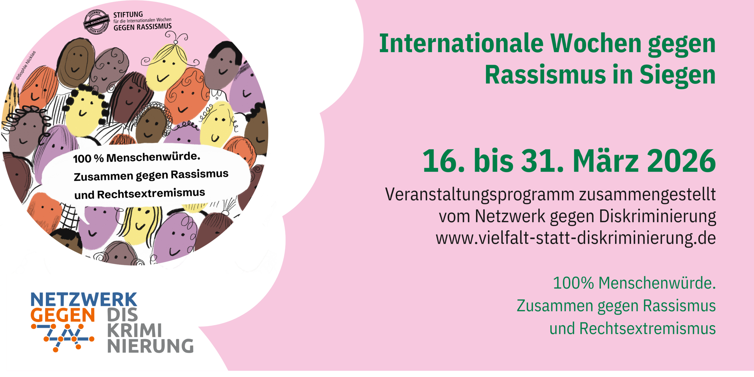 Die Internationalen Wochen gegen Rassismus 2026 finden in Siegen vom 16. bis zum 31. März statt. Unter dem diesjährigen bundesweiten Motto „100% Menschenwürde. Zusammen gegen Rassismus und Rechtsextremismus“ hat das Netzwerk gegen Diskriminierung erneut ein vielfältiges Programm zusammengestellt. Mit zahlreichen kostenlosen Veranstaltungen setzen die beteiligten Organisationen ein deutliches Zeichen für Vielfalt und gegen Ausgrenzung in unserer Stadt.